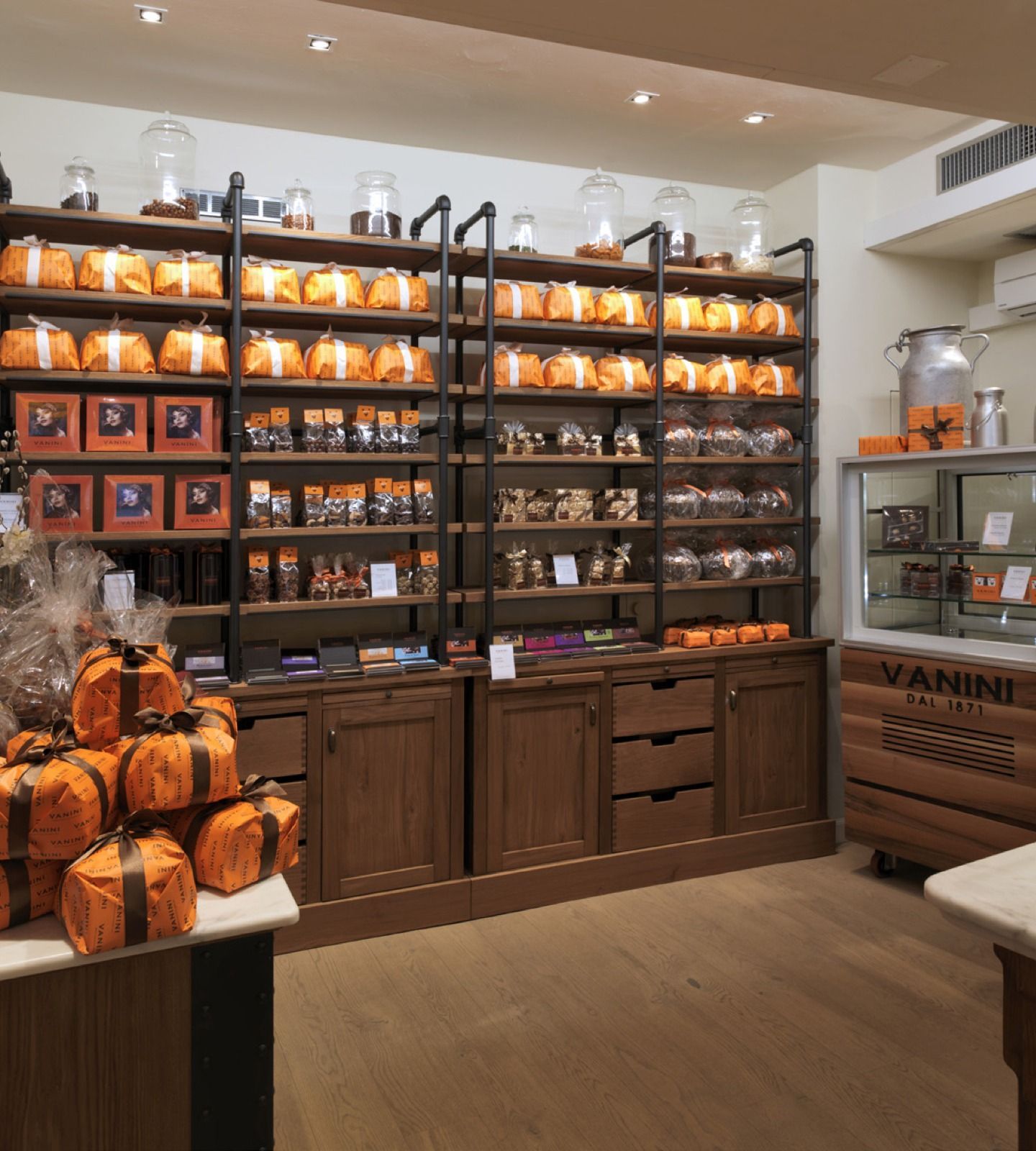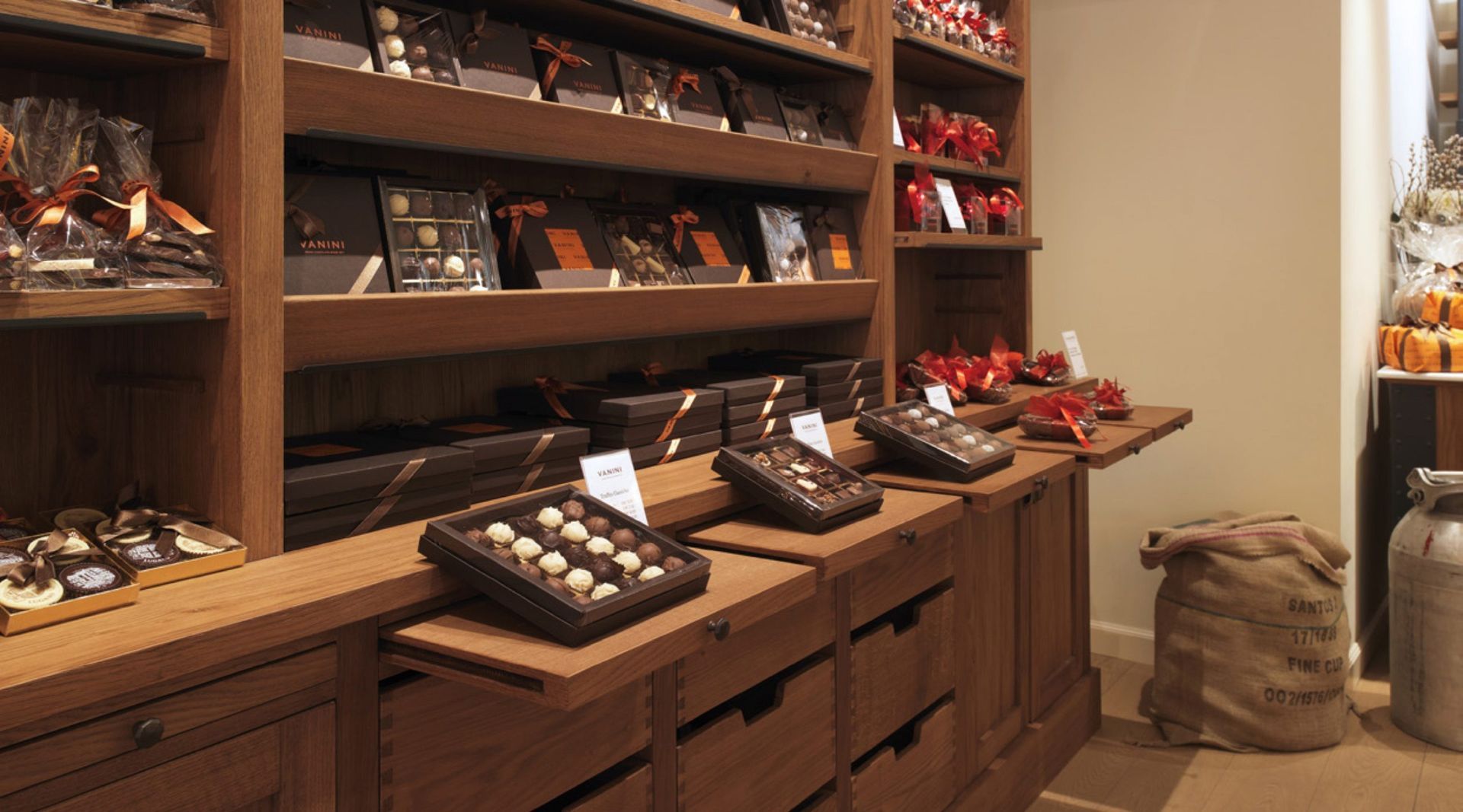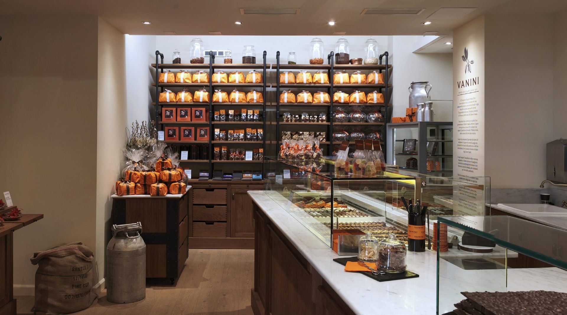 I negozi di questo brand rinomato per la produzione di cioccolato sono caratterizzati da materiali ricercati e raffinati come il marmo bianco di Carrara e il legno di Rovere spazzolato. Un mondo magico ed elegante, in cui cascate di cioccolato colorano un’atmosfera ludica e golosa.
