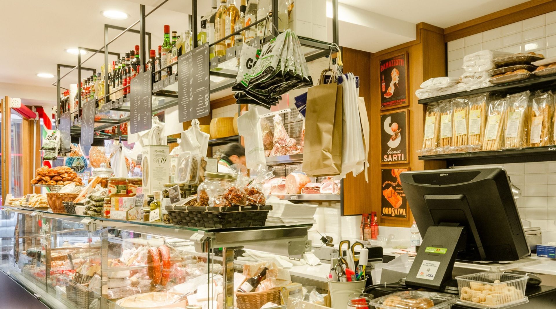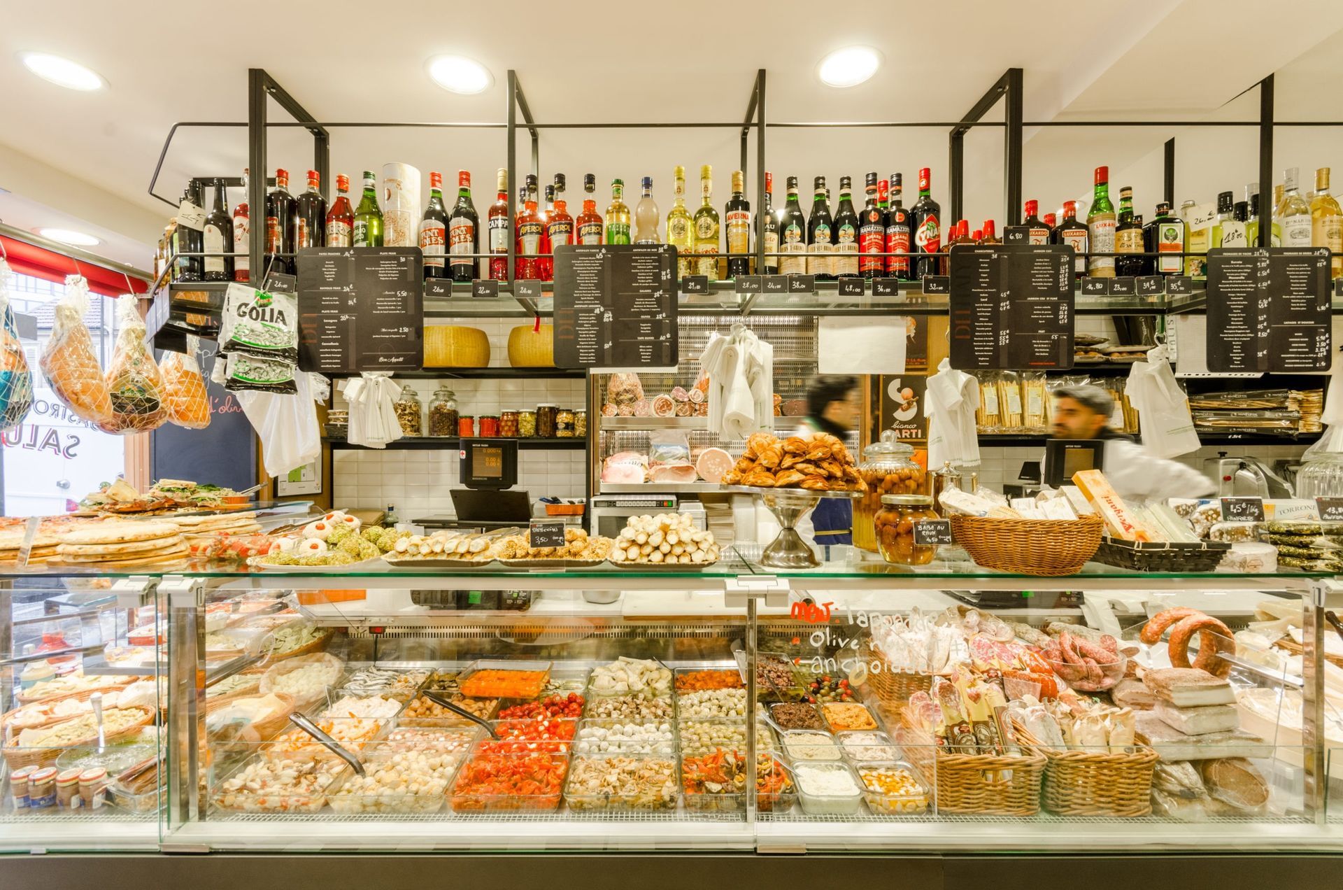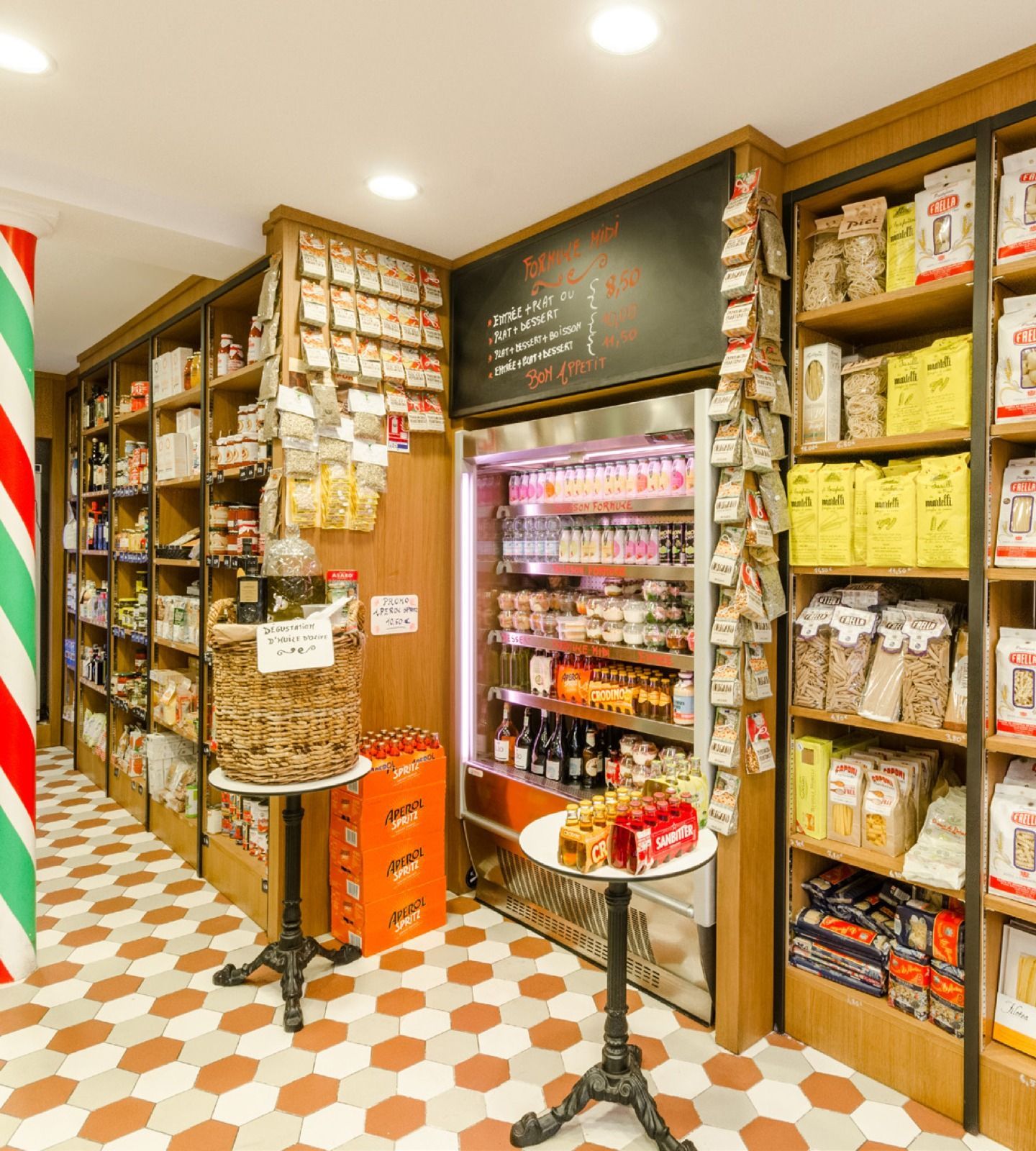 Materiali naturali sono le scelte per gli arredi di questi negozi alimentari di prodotti italiani a Parigi. Il quarzo bianco venato, il legno di rovere abbinato al ferro naturale e i rivestimenti ceramici conferiscono all’ambiente eleganza e luminosità. Per l’esposizione dei prodotti sono stati utilizzati mobili pensili ref rigerati Made in Italy.